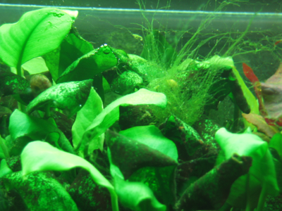 (2) Algen an den Anubien. Selbst die neuen Blätter werden schnell wieder von schwarzen+ grünen Algen überzogen