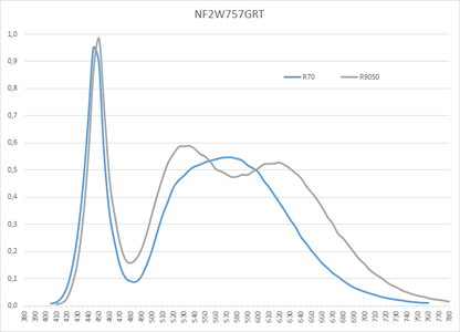 Ich habe nicht meinen Fundus bemüht, sondern eine aktuelle LED, die Nichia NF2W757GR-V1, in der Ra=70- und der Ra=90-Version nachgerechnet.