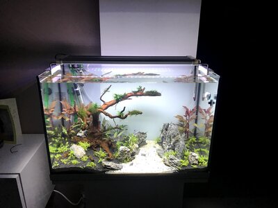 Ich habe mit meinem ersten Aquascape eigentlich schon vor einem Jahr angefangen. Wie immer mit diversen Anfänger Problemen, Algen, usw… durch Flowgrow Forum Rescheren und mitlesen habe ich immer eine Lösung für meinen Probleme. Mit dem Forum hat sich meine Aquascaping Erfahrungen aber auch meine Liebe zu diesem schönen Hobby gewaschen. Dafür möchte ich euch die Experten danken. Ich habe natürlich noch viel zu lernen, insbesondere für mein neue Projekt. Deswegen bevor ich damit starten, poste ich hier meine aktuelle erste Aquascape bevor ich das mit schwerem Herz trenne. Feedback und Kommentare sind herzlich willkommen.
