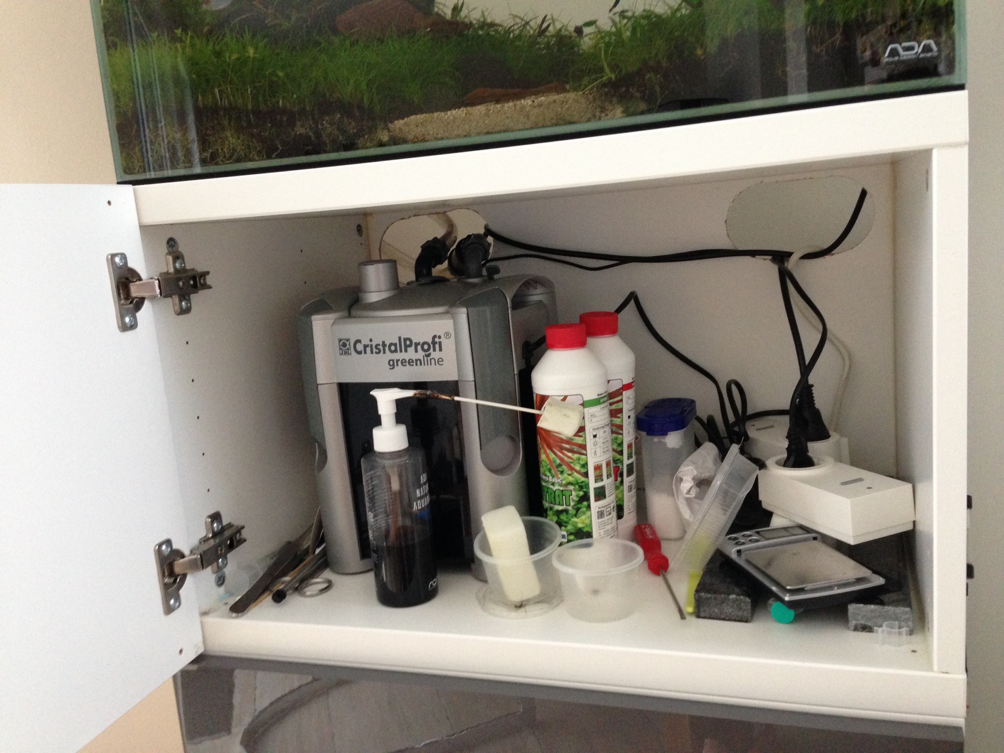 Der Unterschrank ist Besta von Ikea und passt von der Breite her genau.. Den Filter jbl e401 passt genau ins obere Fach. In der Mitte der dunkle Teil ist eine Schublade. Ich hab genug Platz um alles zum Aquarium gehörende Zubehör unterzubringen außer die CO2 Flasche die ist leider zu hoch.