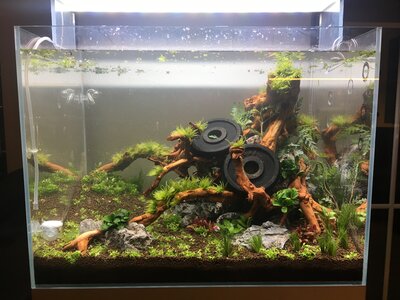 Ich habe während Stunden an der Bepflanzung gearbeitet. Für mich war dies als Neuling im Aquascaping absolutes Neuland und fühlte mich auch entsprechend unsicher. Spass hat es aber auf jeden Fall gemacht. Nach der Bepflanzung habe ich dann gaaaanz vorsichtig mit Osmosewasser (100%) geflutet und aufgesalzen (Duradrakon), ebenfalls natürlich die Pumpe sowie CO2 in Betrieb genommen.