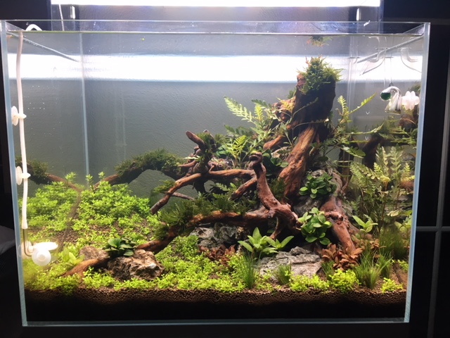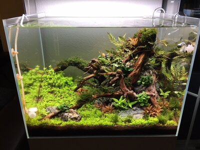 Heute wieder mal ein aktuelles Foto von meinem Scape. Das Becken läuft nun seit 9 Tagen, es entwickelt sich gut, die Wasserwerte sind noch nicht ganz im grünen Bereich. Bin aber frohen Mutes dass sich dies auch bald einmal einpendelt. Nun kommen die ersten Kiesel-/Braunalgen in Form von Punkten auf den Blättern und Wurzel. Werde wohl am Weekend nun ein paar Amanos rein tun.