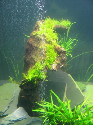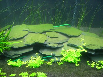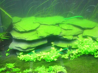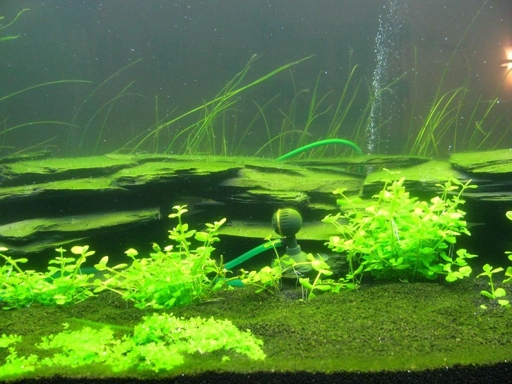 Die Lage hat sich verschlächtert. Grünalgen auf der Scheibe, Steinen und Kies. Fadenalgen auf der Vallisneria nana. Hemianthus fängt auch schon mit Algen an.