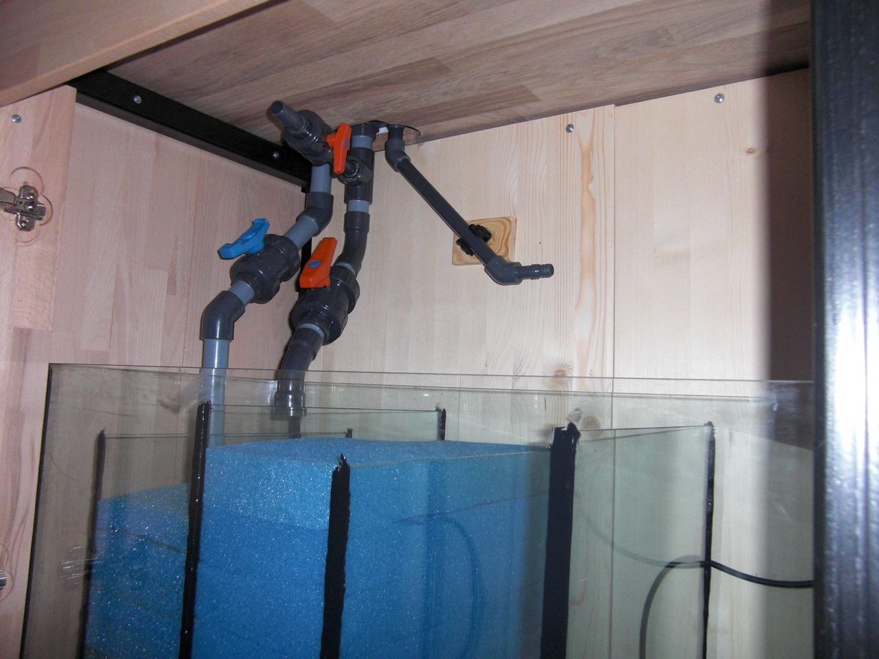 Die blaue seite ist der normale Ablauf, und die rote seite der Notüberlauf, das oben drüber ( 2 Hahn ) ist für den Wasserwechsel, da dran wird ein Gardena Schlauch angeschlossen und fließend Wasser gewechselt ( meine fahrbare Regentonne )