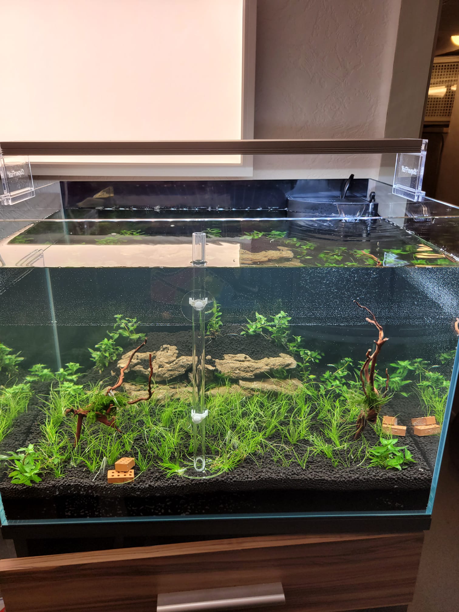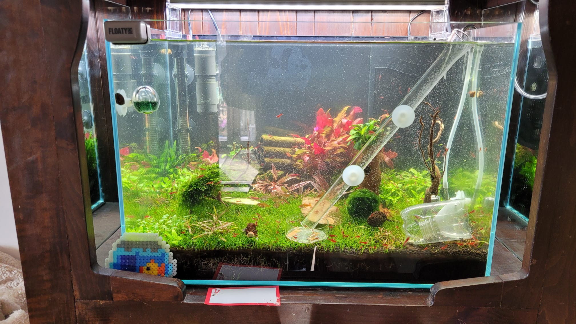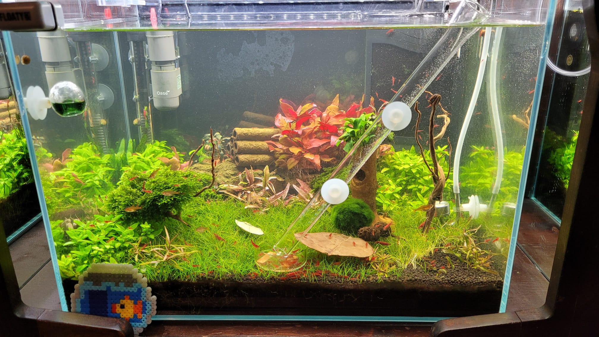 Aktueller Besatz sind X Neocaridina davidi "Bloody Mary" (Start waren 30), 7 Schnecken (1x Neritina pulligera, 3x Clithon sowerbianum, 1x Vittina waigiensis, 1x Clithon corona, 1x Brotia armata) und 8 Hyphessobrycon amandae.