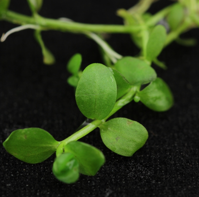 1) Micranthemum, als "Elatine hydropiper" gelabelt, aus in-Vitro-Kultur, eine Weile im Aq. gewachsen. Beachte: Blätter ungestielt (sitzend), bogenförmige parallele Seitennerven beiderseits der Mittelrippe:
