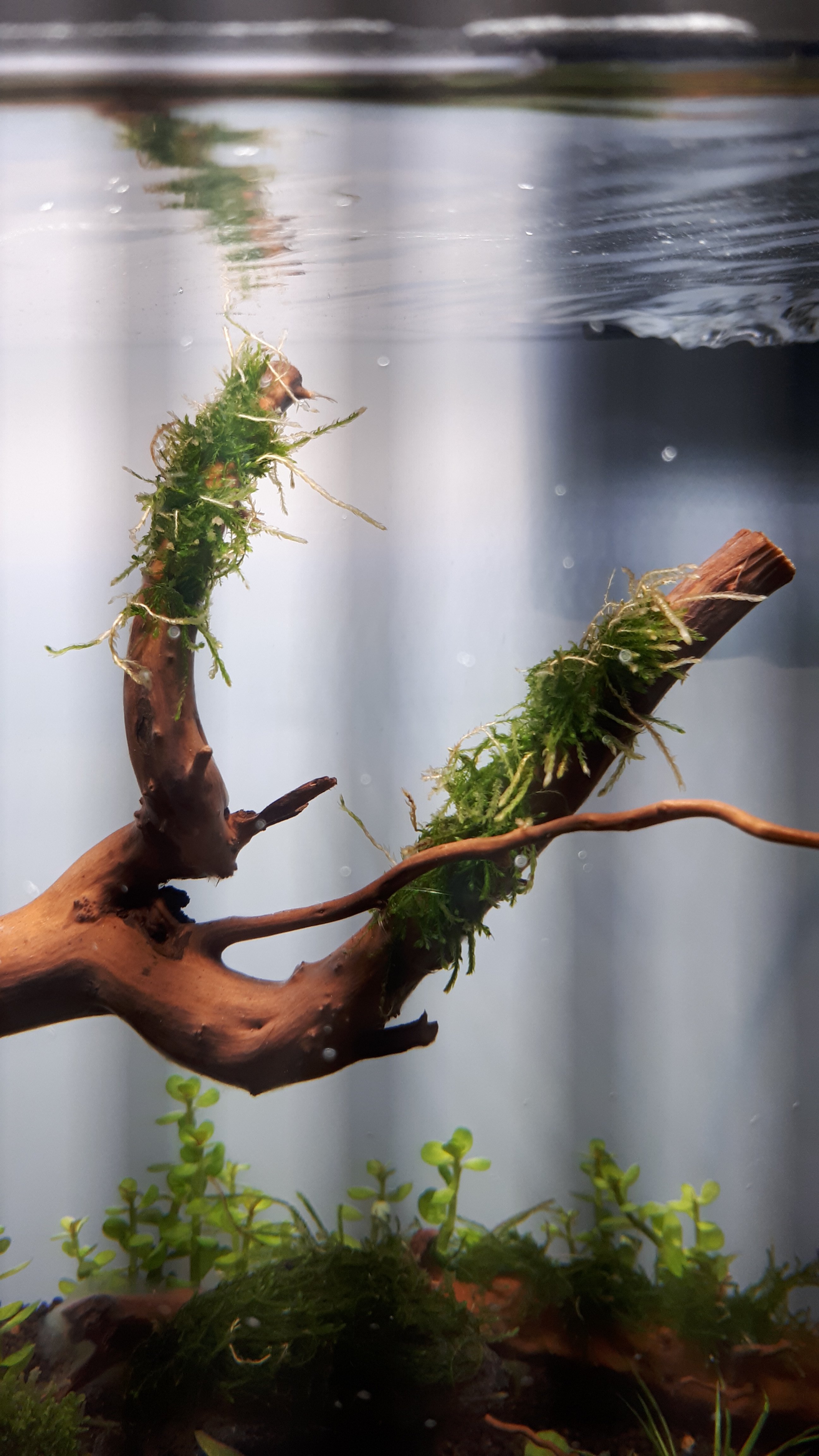 mein neues Aquarium fährt seit gut vier Tagen ein. Das Weeping Moos bekommt einige weißlich bis leicht bräunliche Triebe/Ausläufer. Die neuen Riccardia chamedryfolia Triebspitzen werden leicht grau, teilweise in der Spitze sogar weiß. Können die beiden inVItro Moose bereits nach vier Tagen Eisenmangelerscheinungen aufweisen oder könnten die knapp 50 Lumen pro Liter schuld sein, mit denen ich gestartet bin ("Sonnenbrand")? Das Weeping Moos ist teilweise auf eine Wurzel aufgebunden, dass sehr nahe am Licht ist. Ich kann auch nicht ausschließen, dass der Nylonfaden die Pflanzen an manchen Trieben beschädigt hat. Riccardia chamedryfolia würde ich sagen hat einen gesunden Abstand zur Beleuchtung. Ich arbeite mit Osmosewasser. Nach dem Aufsalzen kann ich keinen Fe-Wert und PO4-Wert nachweisen. Der Environment Soil scheint auch von beidem nichts abzugeben. D.h. Fe und PO4 sind nahezu nicht vorhanden. Sollte ich mit einer leichten Düngung von den beiden Nährstoffen bereits nach vier Tagen starten oder erstmal noch etwas abwarten? Wie geht ihr hier vor? Lieber habe ich leichte Mangelerscheinungen, als Grünalgenapokalypse :lol: