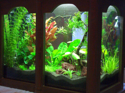 Überlege, aus ästhetischen Gründen, die Alternanthera auszudünnen und nur ein bis zwei Stengel übrigzubehalten als Hingucker. Und davor statt der Echinodorus Tropica evt. Staurogyne spec. oder einen größeren Stein mit dünnen Wurzeln drumrum und Microsorum pteropus Narrow Leaves drauf. Helianthum tenellum (sieht der Blyxa zu ähnlich) raus, dafür Micranthemum umbrosum rein. Vielleicht auch zusätzlich eine Vallisneria nana in die Mitte?