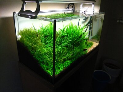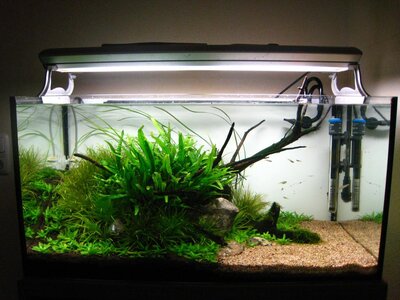 Hab den Microsorum etwas gestutzt und braune Blätter entfernt, links hinten die Staurogyne entfernt und mehr Blyxa hingepflanzt sowie einen Stein ausgetauscht und rechts mehr Staurogyne hingepflanzt.
