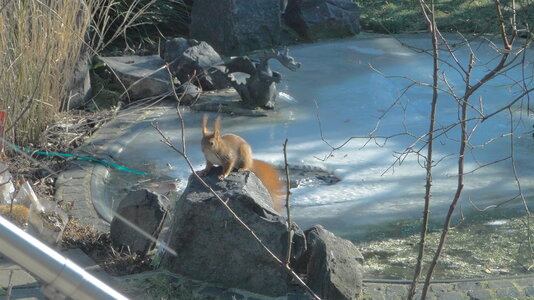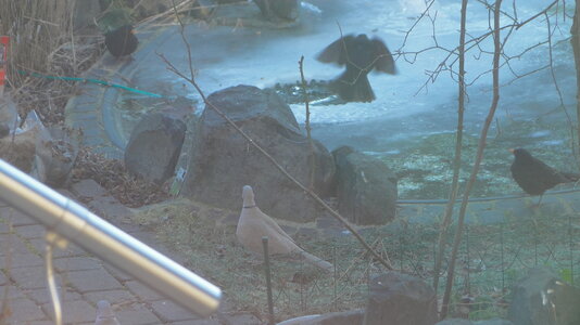 es ist mehr Zufall, denn ich hatte eine Wisa laufen lassen, damit das Teichlein nicht ganz zufriert. Hier in Frankfurt sind wir klimatisch durchaus begünstigt, aber bei -12°C hat die Tierwelt, die wir bewusst füttern, ein ganz spezielles Problem, das mir vorher gar nicht gegenwärtig war. Wie sollen die bei klirrendem Frost an Wasser kommen? Entsprechend entwickelt sich das Teichlein zum absoluten Mittelpunkt.