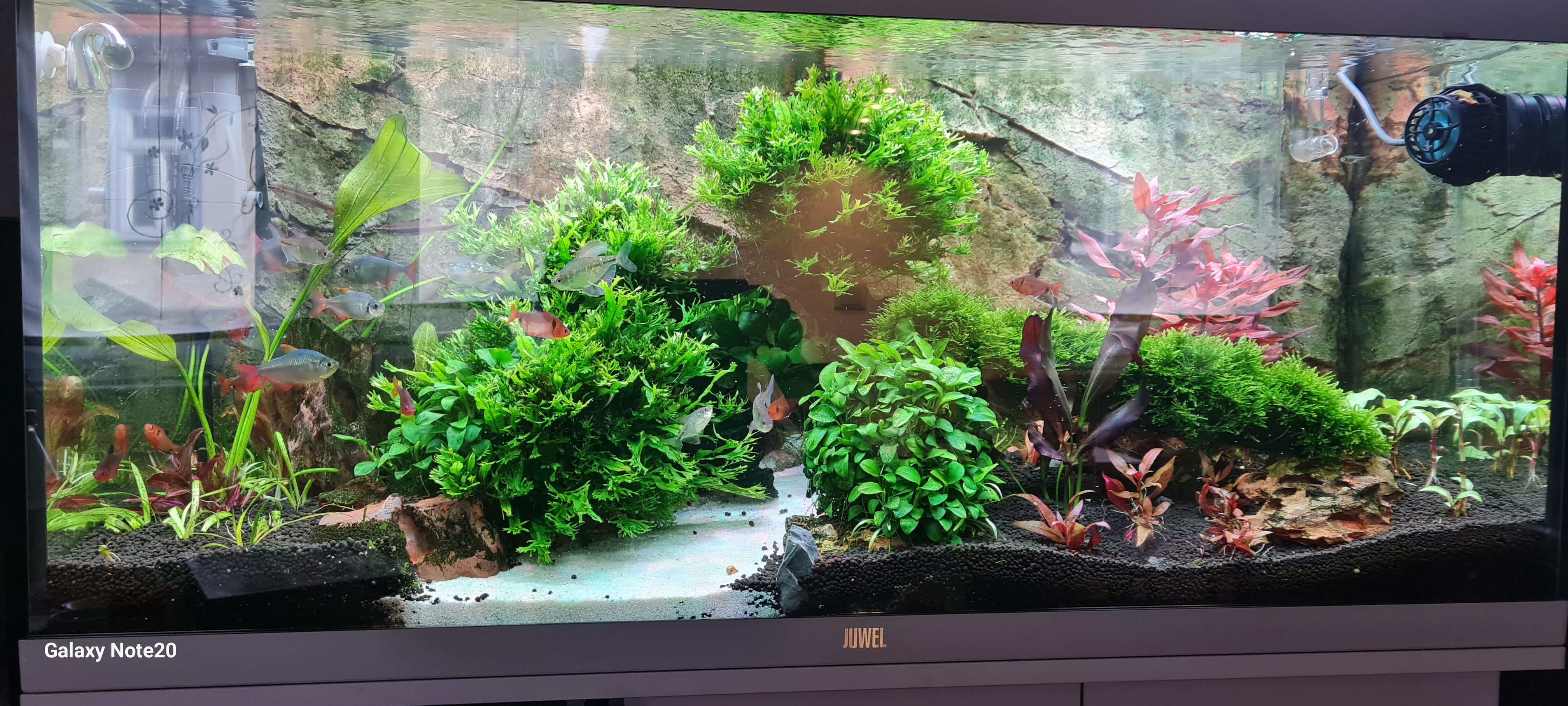 Hi, das Becken sah zwischendurch mal so aus. Der Großteil hat dann das Wachstum eingestellt und es fing wieder an Grün zu werden. Auf dem Bild wollte die Rotalla im Hindergrund schon nicht mehr. Das 2. Bild ist mein Zwergsalmlerbecken. Ebenfalls mit UVC im Dauerbetrieb. Gedüngt mit AR NPK, GH Boost N , AR micro Eisen. Da habe ich schon seit Wochen nicht mehr gemessen. Einfach nur die Flaschen der Dosieranlage füllen, Pflanzen schneiden, Wöchentlicher Wasserwechsel, Mulm sagen etc. Quasie ein Selbstläufer.Alles klar, bei diesen Pflanzen sehe ich jetzt keine welche wirklich bis zum blubbern assimilieren sollte.