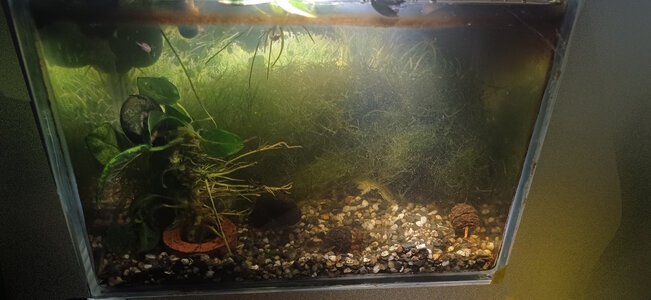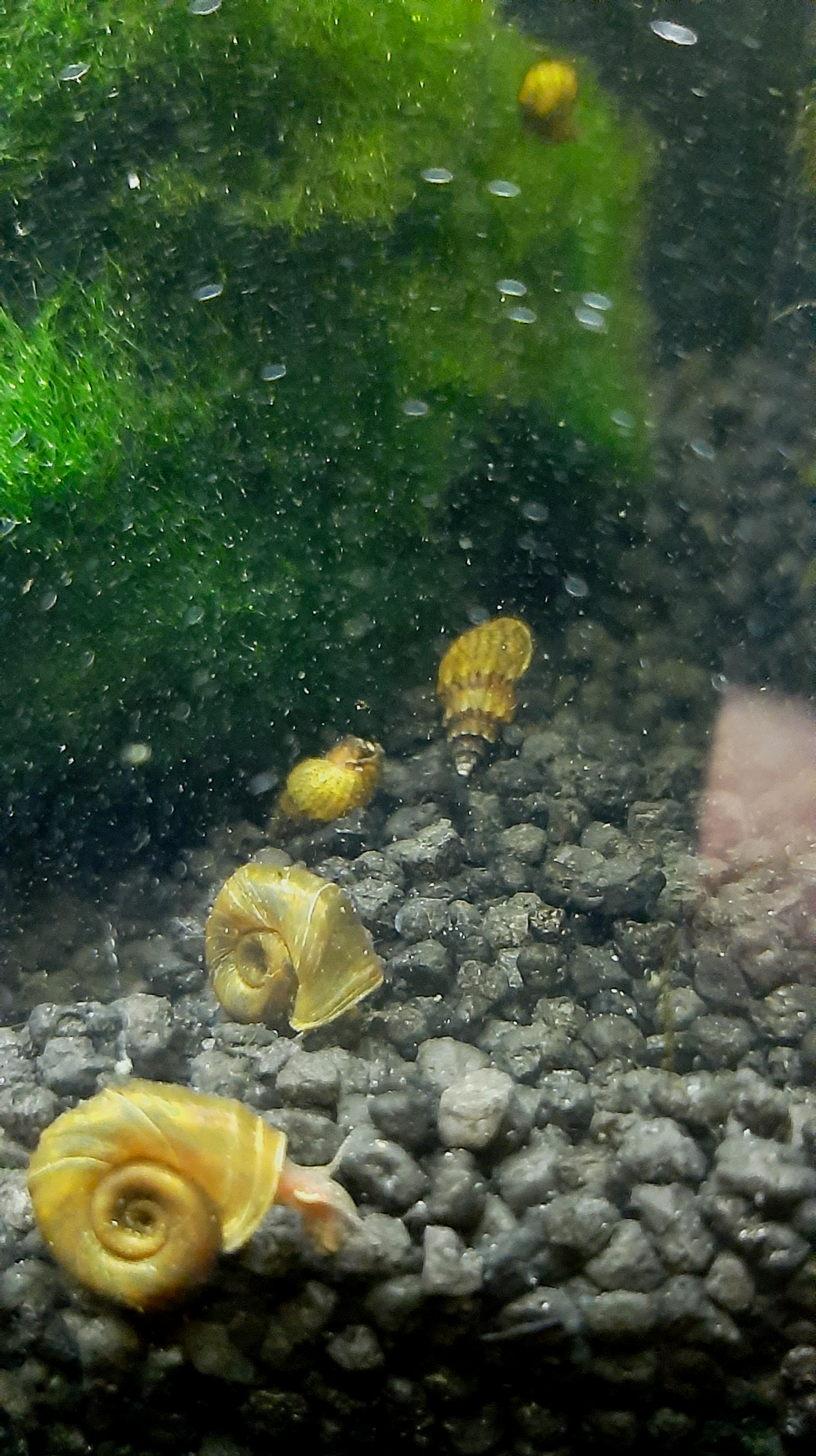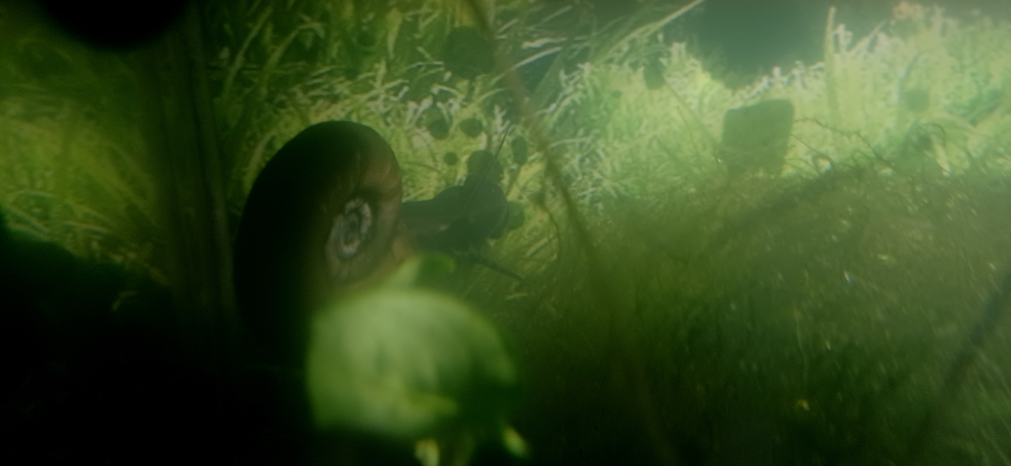 Hier geht Alles seinen Gang, nur die Anubia mag nicht so recht. Es ist wohl zu wenig Licht für sie. Ich bin am überlegen ob ich die Leuchte abnehme und das Aquarium wieder unter das Dachfenster stelle. Allerdings wird es dort im Sommer recht warm, was den Temperaturansprüchen der Schnecken zuwiederlaufen könnte.