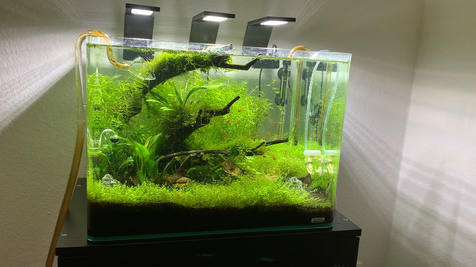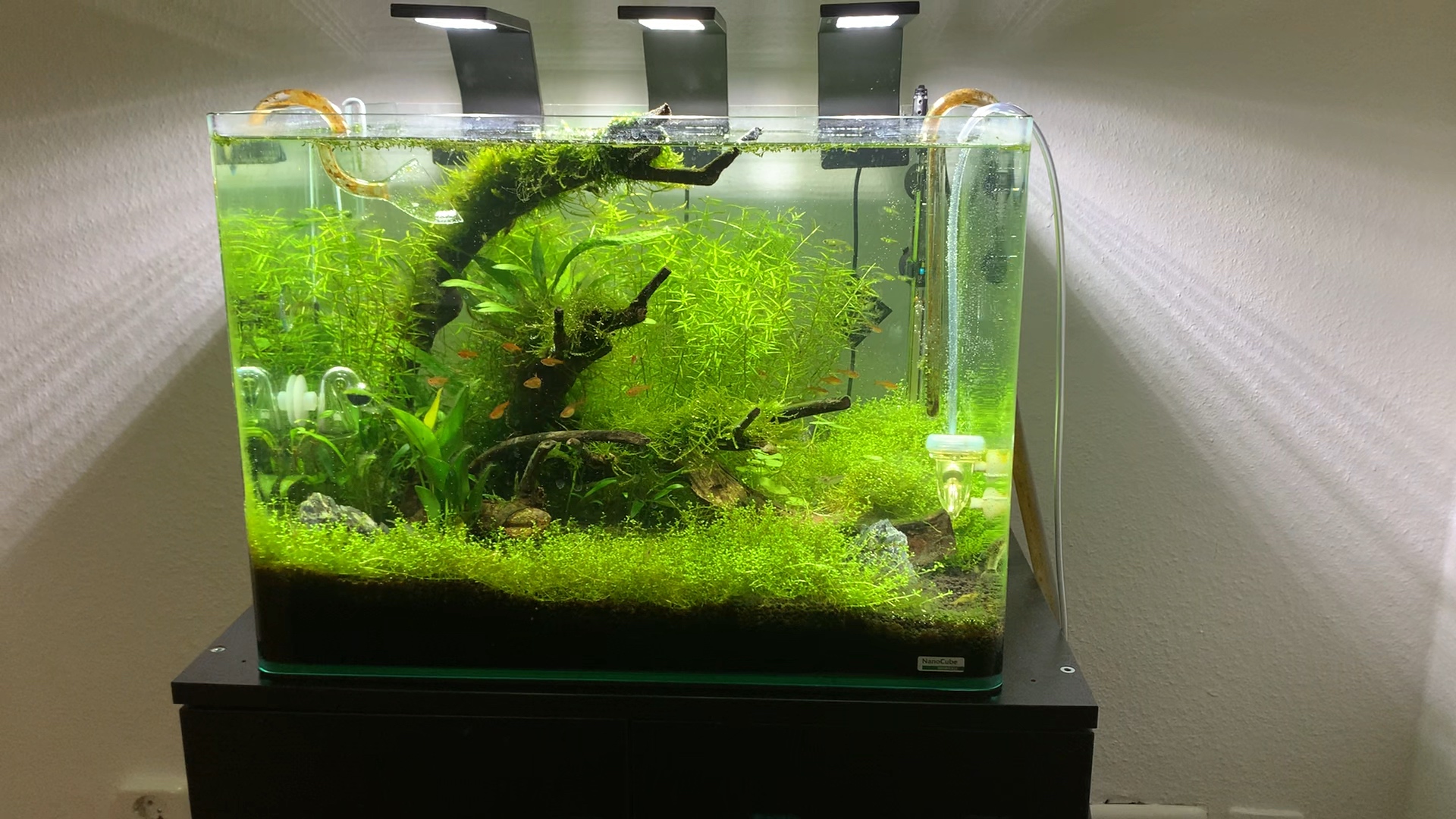 80x40x40, 128 L 2x24 Watt T5 Vollspektrum drüber, das sind grob 30 lm/l, definitiv Unterkante was so ein Becken braucht. Macht aber nichts weiter. Wichtig ist eine eher üppige Nährstoffversorgung, HCC ist ein Stickstoffliebhaber, die Düngung kann man in meinem Spoiler nachsehen. Ansonsten ist das mit gewaschenem, ungedüngten Sand und einem runden Aufsteckschwamm gefiltert. Vielleicht fallen dir,