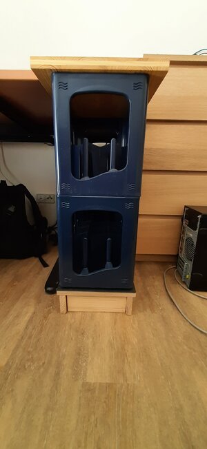 Der Schrank für das Becken, dass längs zwischen meinen Schreibtisch und eine Kommode kommt, ist im Bau. Ich möchte gern vom Schreibtisch aus ins Aquarium schauen, damit die Tage mit Homeoffice etwas bunter werden. Die obere Platte ist frisch geölt, unten kommt noch ein Sockel drunter, damit das Ganze auf der Höhe des Schreibtischs endet.