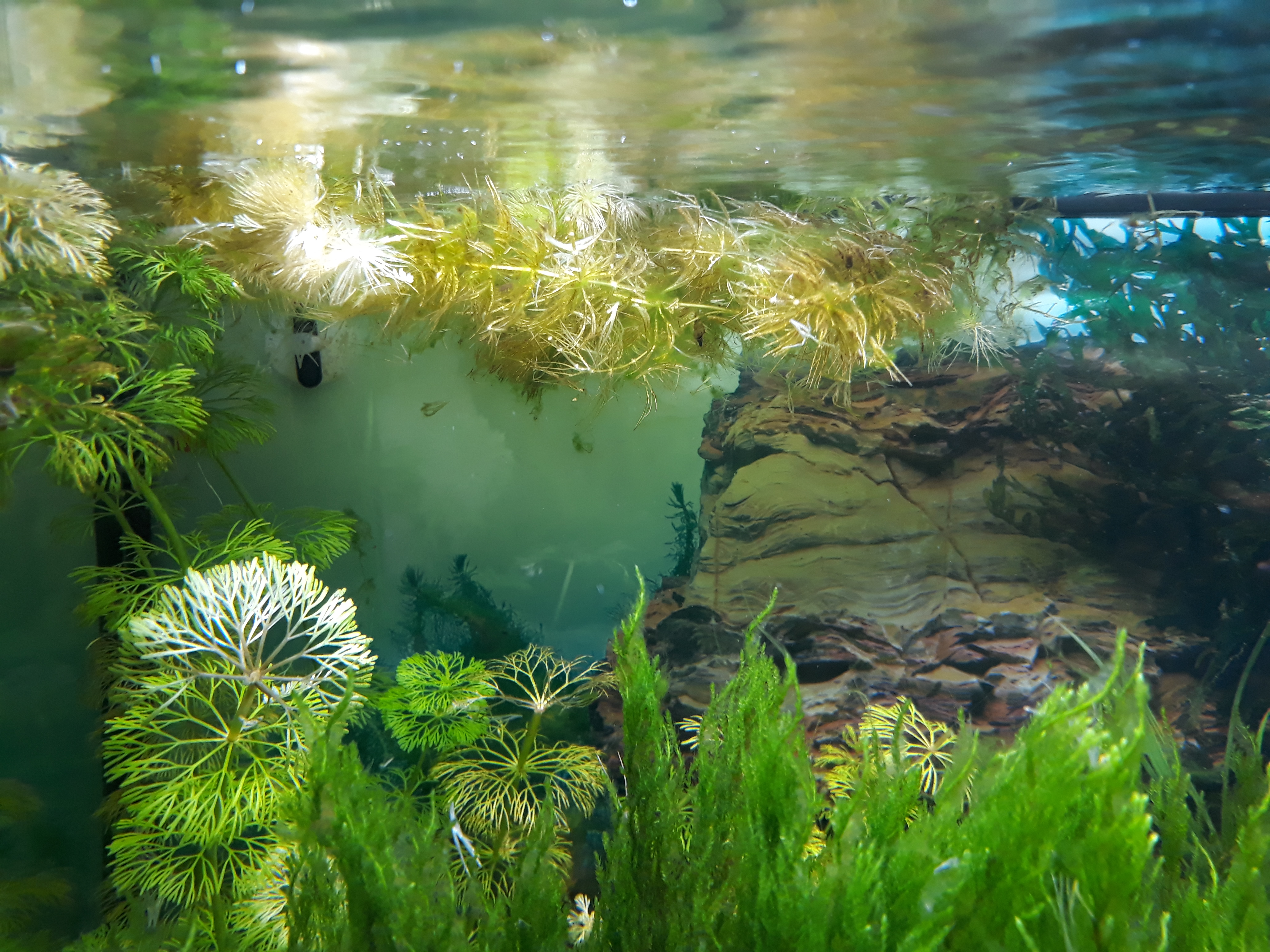 Wie ihr in der Pflanzenliste bereits lesen konntet, krüppelt eigentlich alles außer dem Moos fröhlich vor sich hin, stirbt allerdings nie vollständig. Das Ganze liegt meines Erachtens klar an einem Eisenmangel, auch wenn keine der Pflanzen für mich ersichtliche Chlorosen hat. Dünge ich nun aber Eisen über den Profito nach, legt sich auf das Hornblatt ein bräunlicher Film und im Becken machen sich explosionsartig Grünalgen breit. Zusätzlich kann ich mir den hohen Kaliumwert nicht erklären.