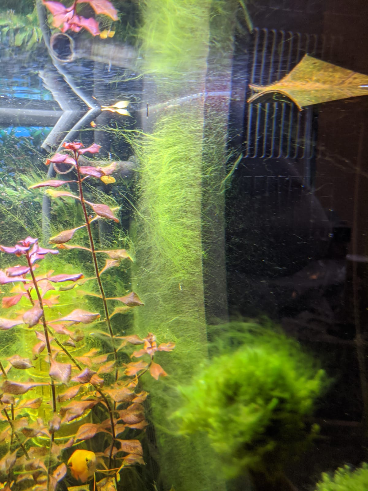 Warum scheinen die Pflanzen die vorhandenen Nährstoffe, allen voran das dringend benötigte Eisen, nicht umsetzen zu können? Kann sowas mit der scheinbar diagonalen Beckenströmung zusammenhängen? Denn das direkt in dieser "Schneise" lebende Flammenmoos fühlt sich mächtig wohl.
