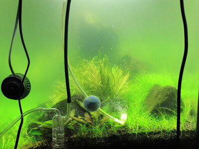 Über Nacht wird das Wasser grün, Wasser wird mit jeder Stunde wo das Licht an ist klarer und Staubalgen machen sich auf Strömungspumpen, Glaswaren und an den Scheiben direkt im Pflanzenbereich breit.