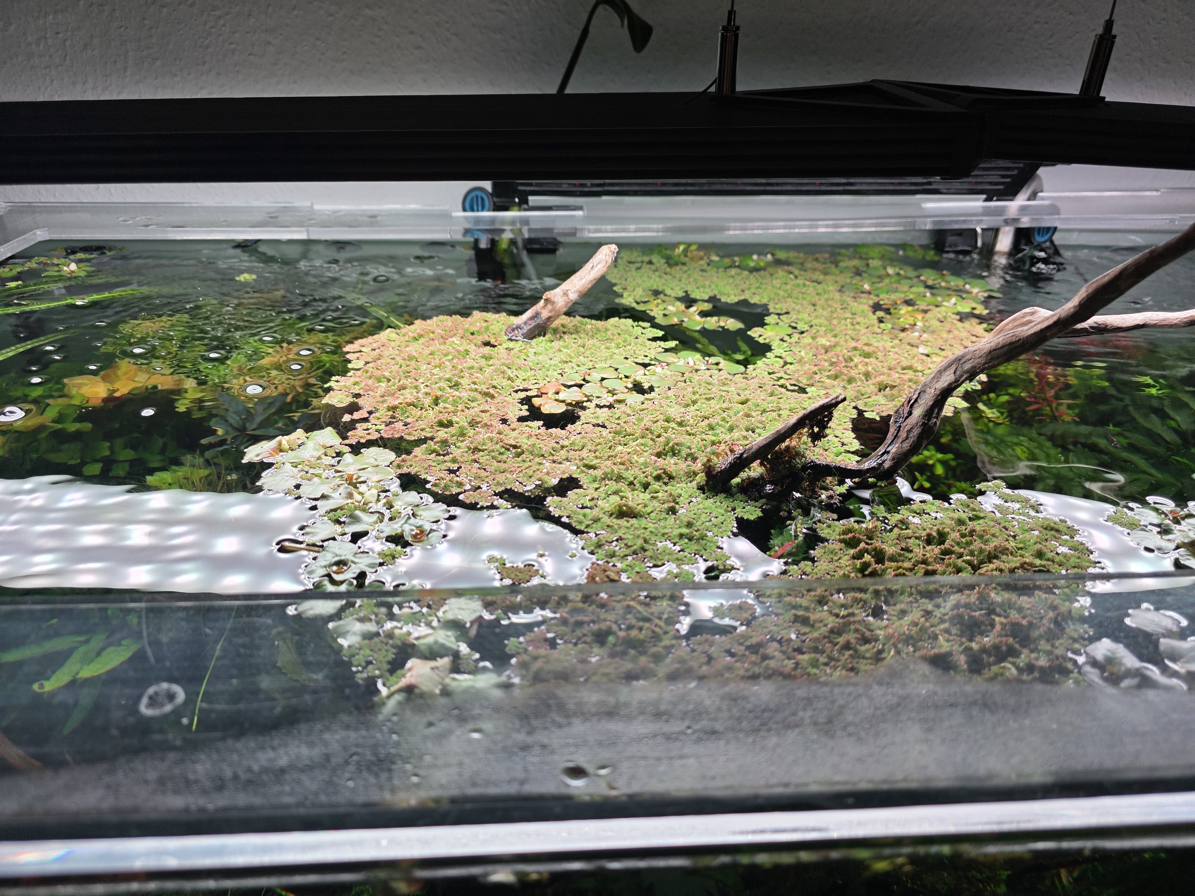 Habe eine CO2 Anlage, diese aber nicht ein geschaltet, da die Tiere dann am kommenden Morgen Luftschnappend an der Oberfläche hängen.