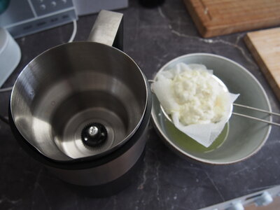 Calzium und Magnesiumchlorid hatte ich leider auf die Schnelle nicht zur Hand. Öl emulgiert in der Molke nicht, Fettaugen schwimmen keine drauf, nach Knoblauch riecht sie auch nicht, also ist alles im Tofu. Das wird natürlich noch mit Chlorella, Sprulina, Ca/Mgchlorid, Zitrone (Vitamine) und Leinöl (HUFAs) versucht.
