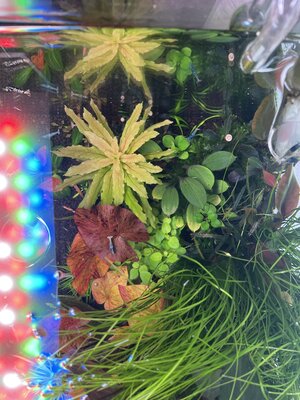 Diverse Bucephalandra und Anubias - Brownie Phantom Mini, Kiishi Dark, Brownie Metallica, Catherine Supermini, Penelope. (Empfinde ich mittlerweile als weniger spannend, da es einfach zu viele sehr ähnliche gibt. Die klar erkennbaren sind aber cool, beispielsweise Penelope und Kiishi.) Die Bucen stehen zum allergrößten Teil nur im Becken, um sie später im mittelfristig geplanten 60er zu verwenden, stören im Cube meiner Meinung nach)