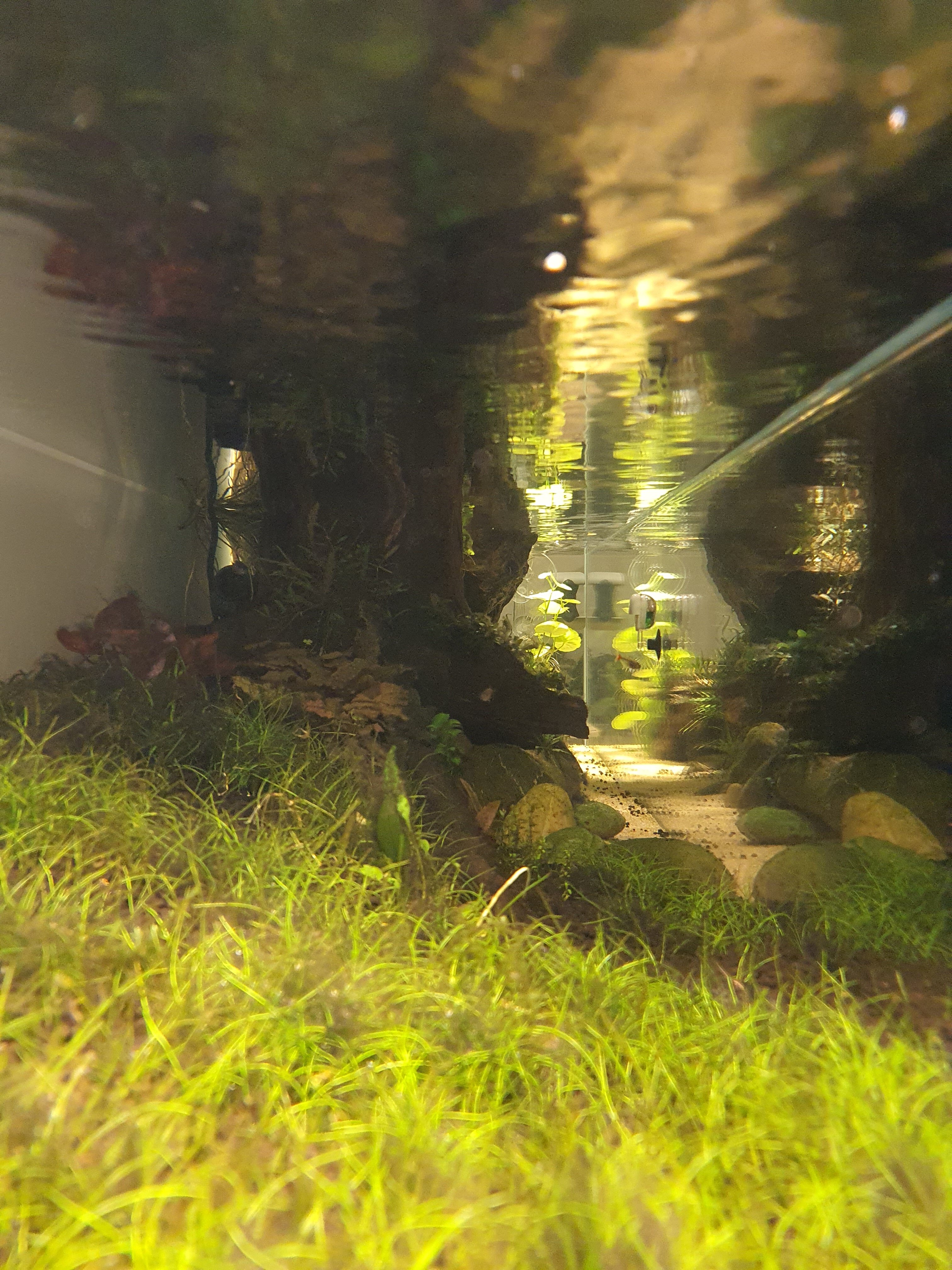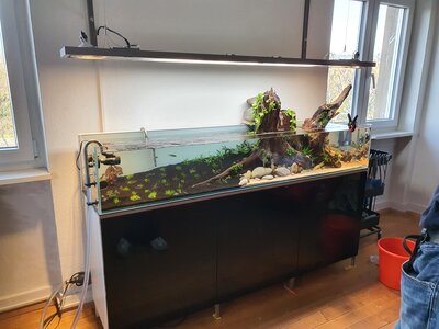 Sooo ich meld mich zurück mit ein paar Bildern. Das Aquarium läuft jetzt seit ca. 1 1/2 Wochen Besatz ist schon drinnen da der Filter mit 2L siporax schon eingelaufen ist. Wasserwechsel mach ich momentan alle 2-3 Tage ca.50% Werte mess ich jeden Tag bisher kein Nitrit oder des gleichen. Den Emersen Teil auf den Wurzeln bewässer ich mit 6mm Schläuchen und einem umgebauten eheim Skimmer als Pumpe