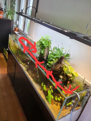 Wenn die Chihiros zu sehr nach unten zeigt könnte man auch versuchsweise ein Stück aquarientaugliches Plastik mit Kabelbinder an der Unterseite vom Auslass fixieren, etwas über den Rand vorne herausstehend, so dass die Strömung mehr gerade oder nach oben geleitet wird.