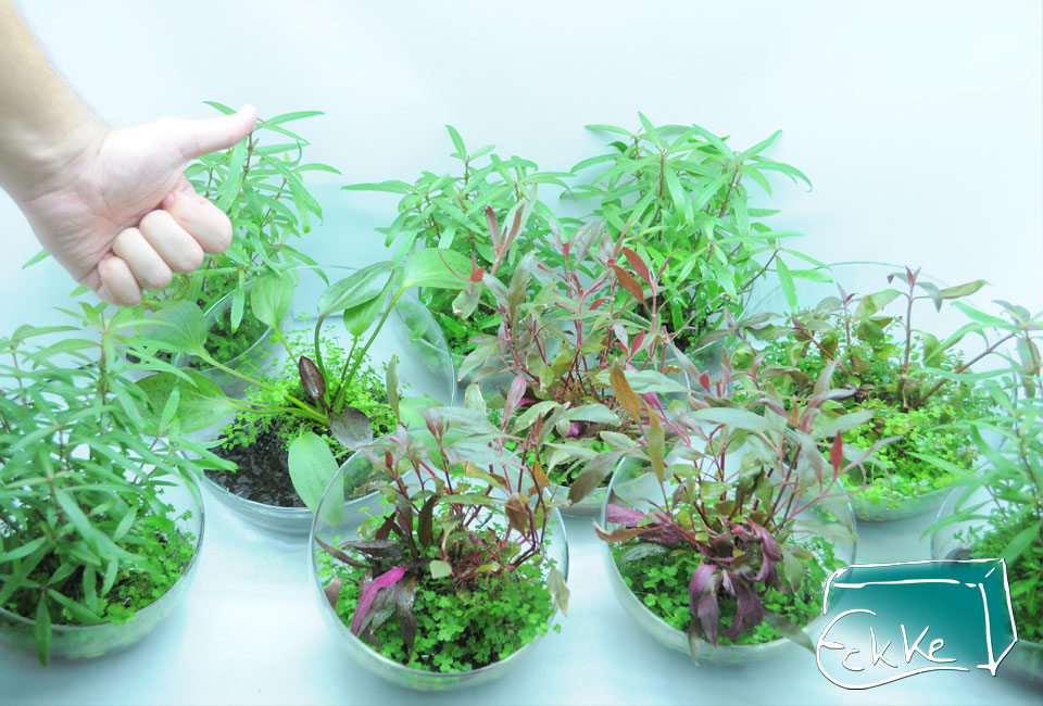 Ich hatte auch das Glück, dass ich mich an den Midori von Anubias ausprobieren durfte. Im Juli letzten Jahres habe ich 10 Midoris (8x Größe S, 2x Größe M) in einfachen Glasschalen aus einem Deko-Geschäft herangezogen. Dazu einfach in ein leeres Aquarium alle Schalen gestellt und die Leuchtstoffröhren jeden Tag 10h angelassen. Zusätzlich habe ich sie jeden zweiten Tag mit Aquarienwasser besprüht. Als Substrat hat altes Soil hergehalten.