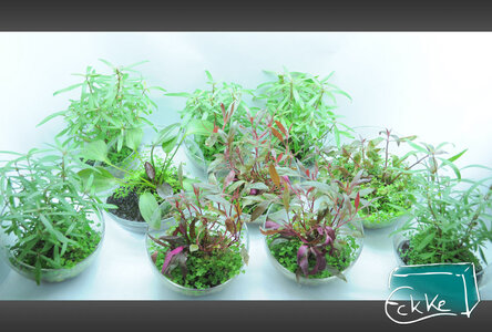 In beiden Wabi Kusas habe ich Lavagranulat als Drainage verwendet, darauf Dennerle Soil. Die Schalen werden mehrere male am Tag mit Osmosewasser besprüht, was scheinbar ausreicht da die Pflanzen gut wachsen und nicht austrocknen. Die Düngung erfolgt bis jetzt nur über BW Bodenzusätze "Red". Läuft... :wink: