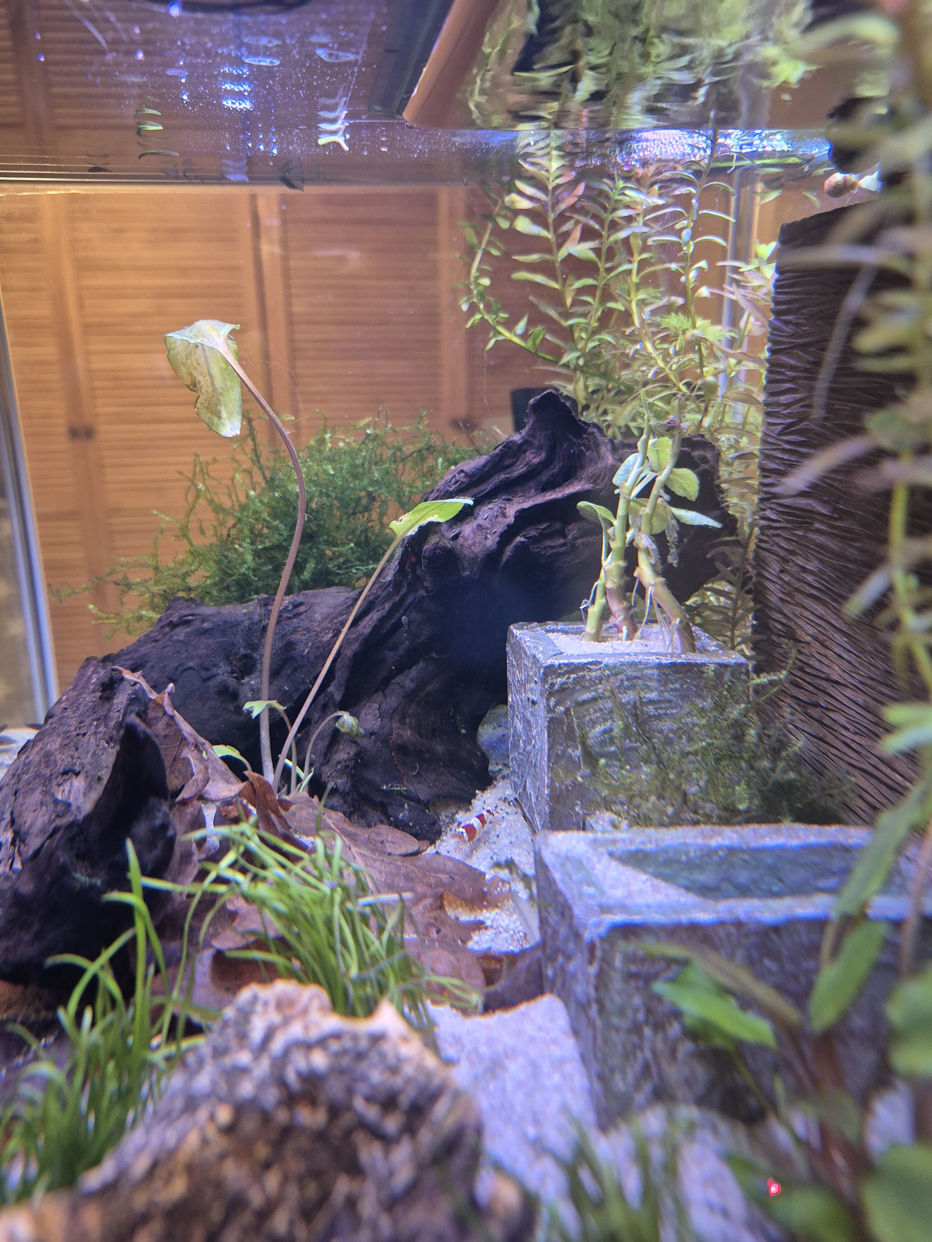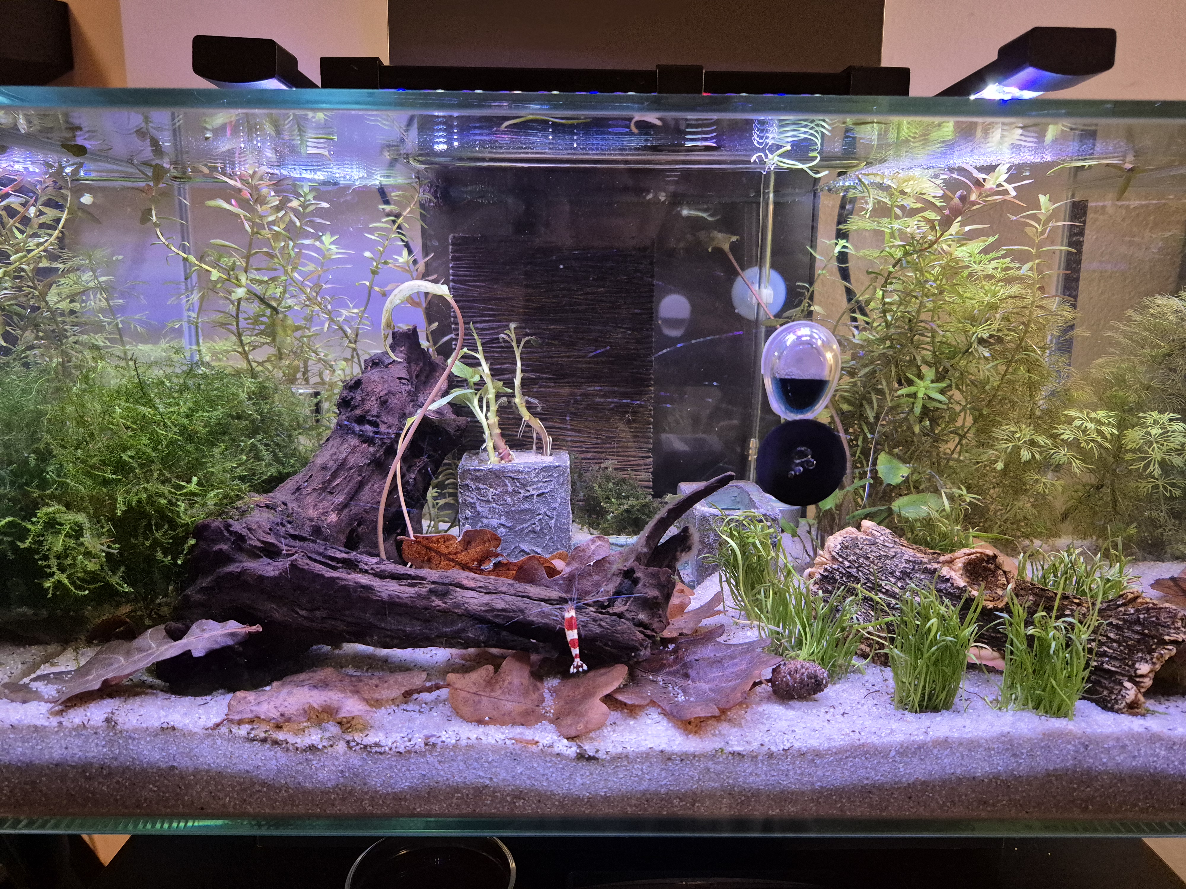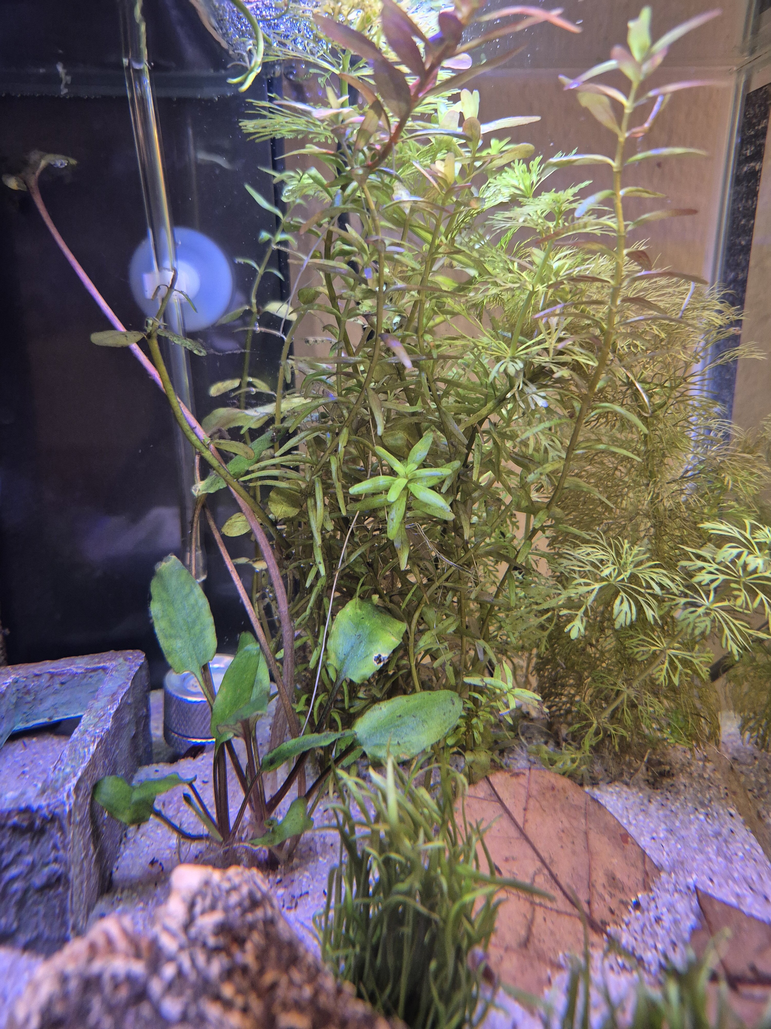 Bisher gibt es auch so gut wie keine neuen Algen, allerdings lösen sich die Cryptos und die Lobelia gerade auf. Ich hab nun diese Bodendüngekugeln in den Sand gesteckt. (Kann man die eigentlich teilen- die ganze Kugel passt nicht in das Pflanzdings?)