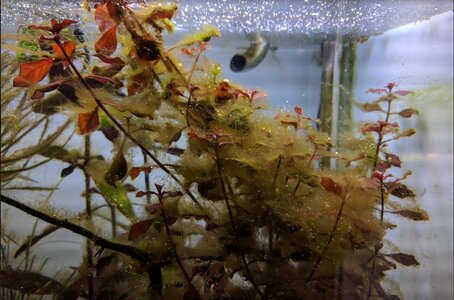 Ich sauge die Alge derzeit fast täglich mit einem Schlauch so gut wie möglich ab. Sie hängt mittlerweile aber ab fast allen Pflanzen und Wurzeln.