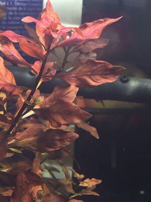 Ludwigia palustris super red zeigt verkrüppelte Spitzen, helle Blätter und Nekrosen an älteren Blättern.