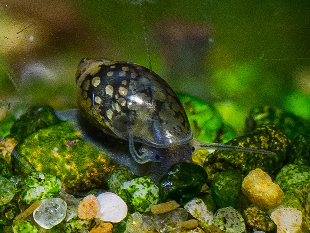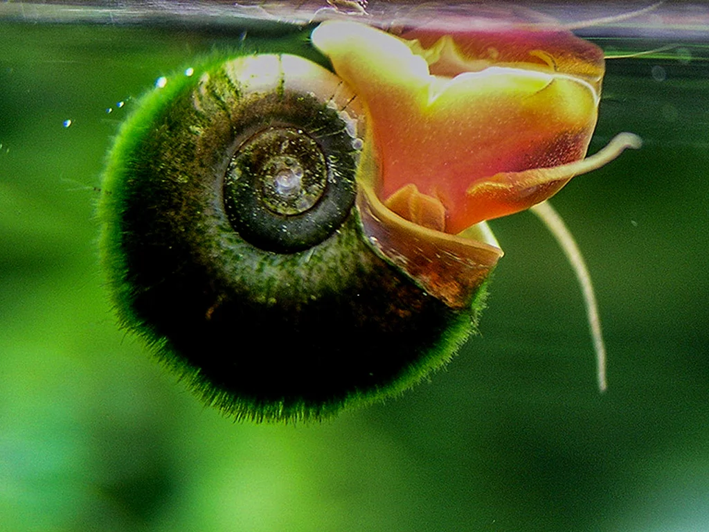 Posthornschnecke 2008, Blasenschnecke 2016, Amanogarnele 2019, von Pelzalgen besiedelte Posthornschnecke beim Abweiden der Wasseroberfläche 2020.