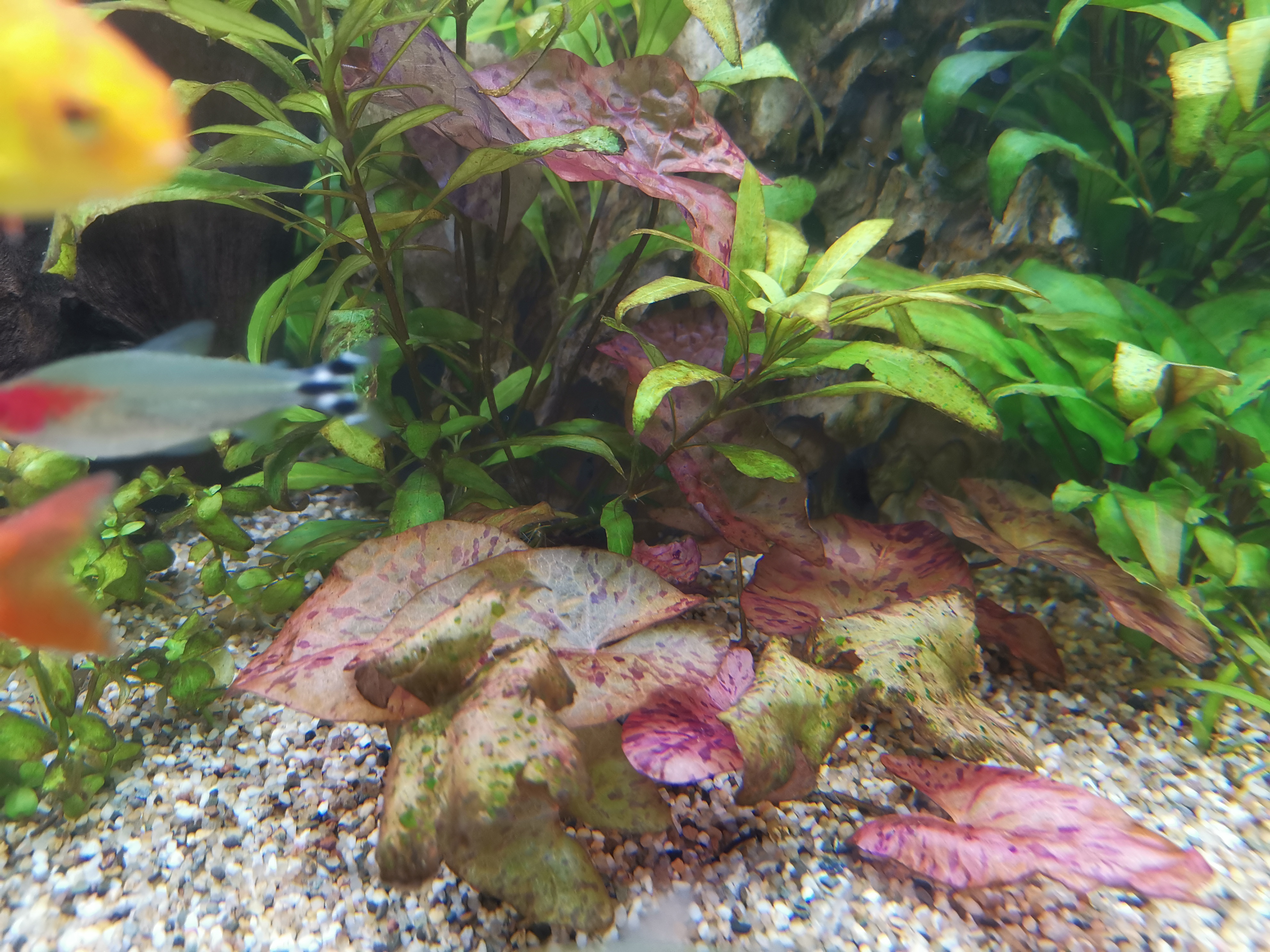 Die am 20.12 neu zugesetzte Hygrophila wächst, andere, ältere, z.B. die Ludwigia rechts, wächst gar nicht mehr. Auf den Blättern ist ein Algenbelag.